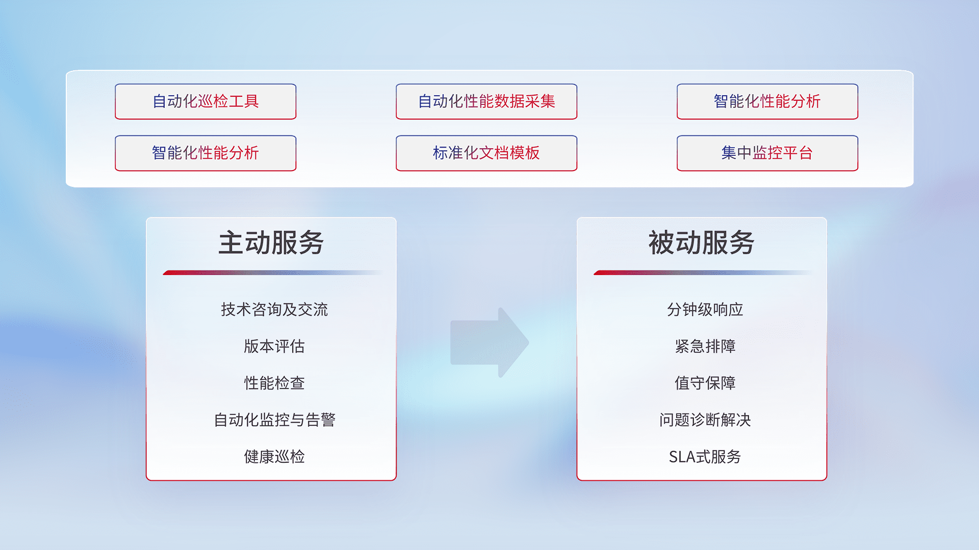 智能化工具和标准化文档,,,,保障服务质量,,,提供主动服务(包含技术咨询、、版本评估、、、性能检查、、、、自动化监控与告警、、、健康巡检)和被动服务包含(分钟级响应、、紧急排障、、、值守保障、、、问题诊断解决、、、SLA服务)。。