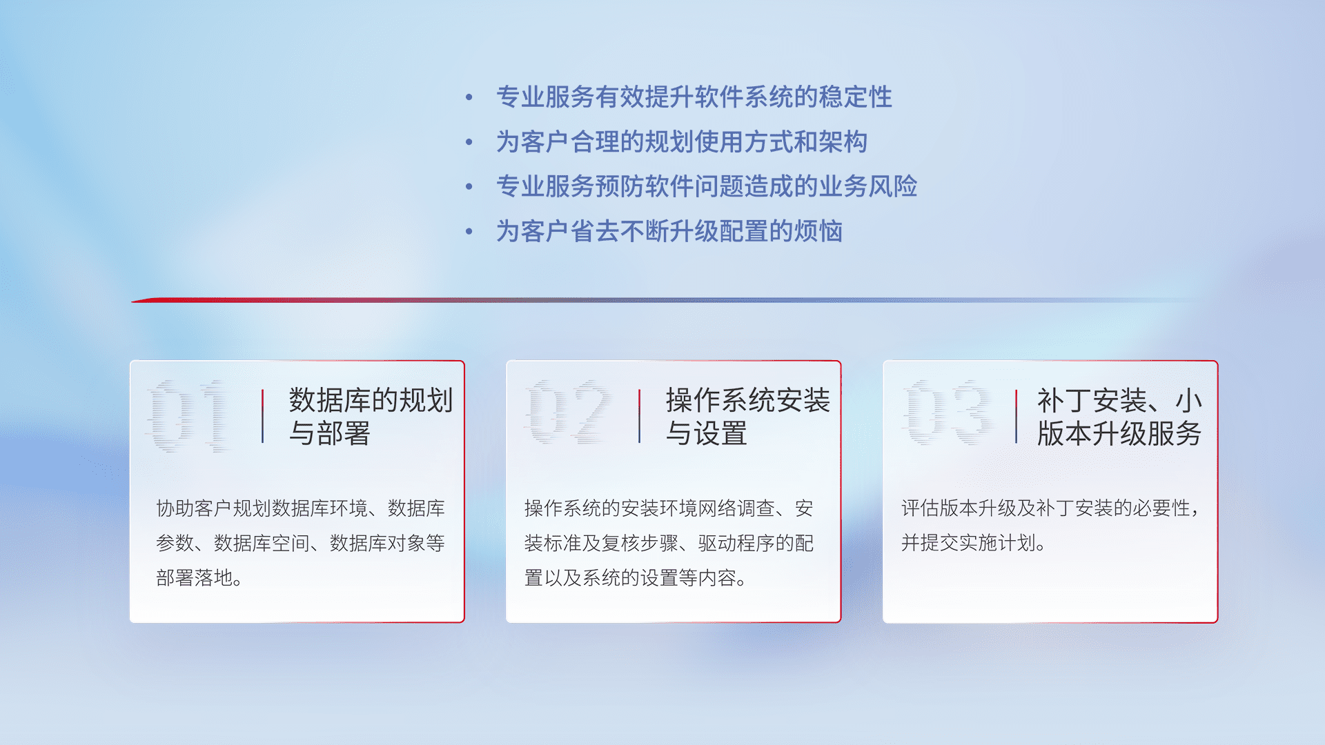 为客户提供软件规模升级、、、快速部署、、、、按需配置的专业服务,,,,从数据库的规划与部署到操作系统的安装与设置,,,,再到补丁安装和小版本升级提供支持。。
